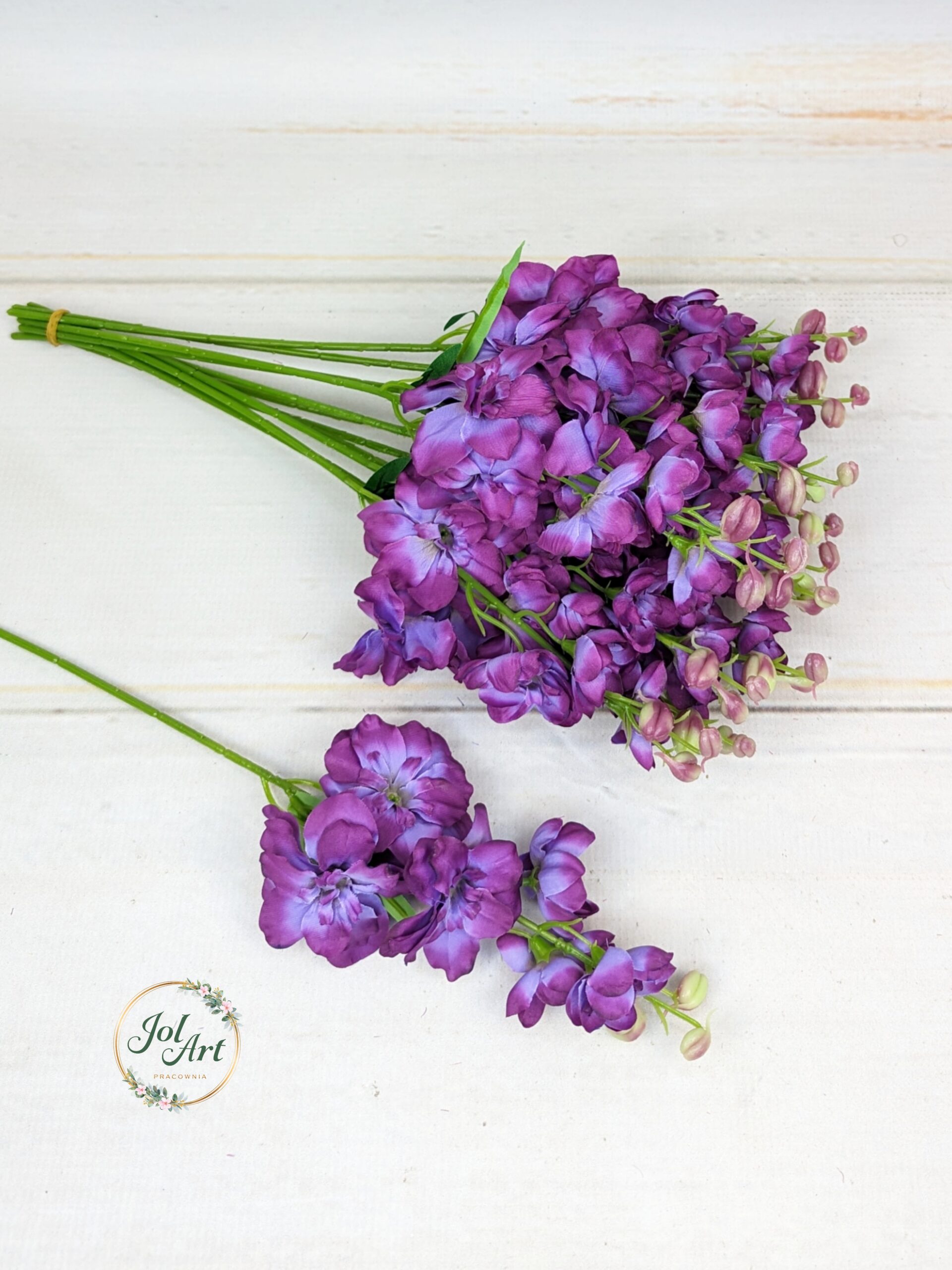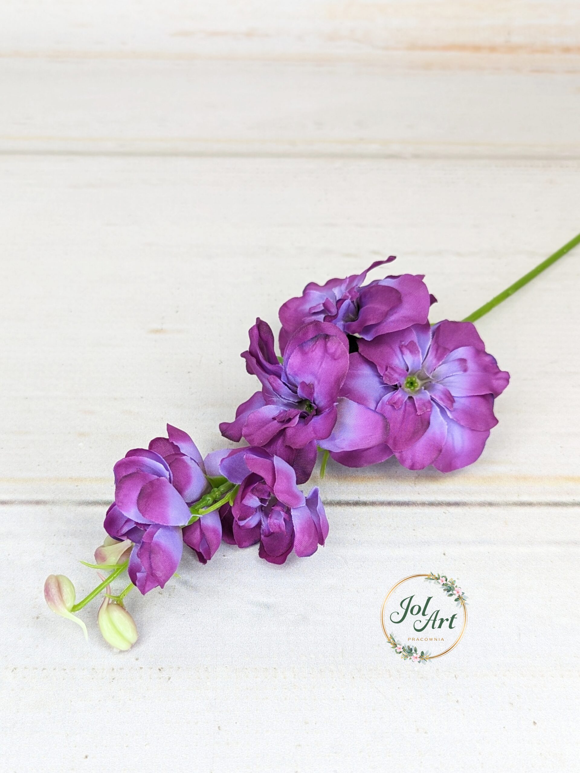 Ostróżka na piku to idealne wypełnienie do kompozycji. Krótki pik pozwala na umieszczenie gałązki w gąbce florystycznej lub niedużej kompozycji w wazonie. Gałązka długości 45 cm z kilkoma główkami kwiatowymi, zakończona imitacją pączków kwiatowych.