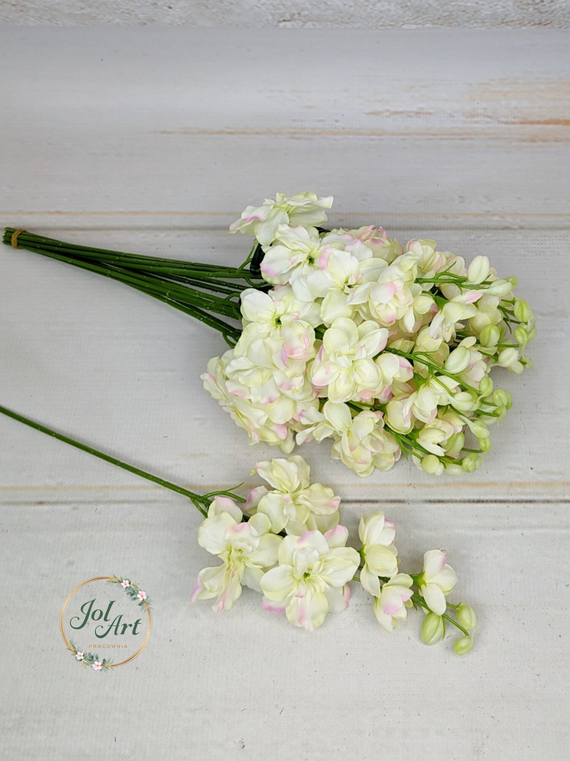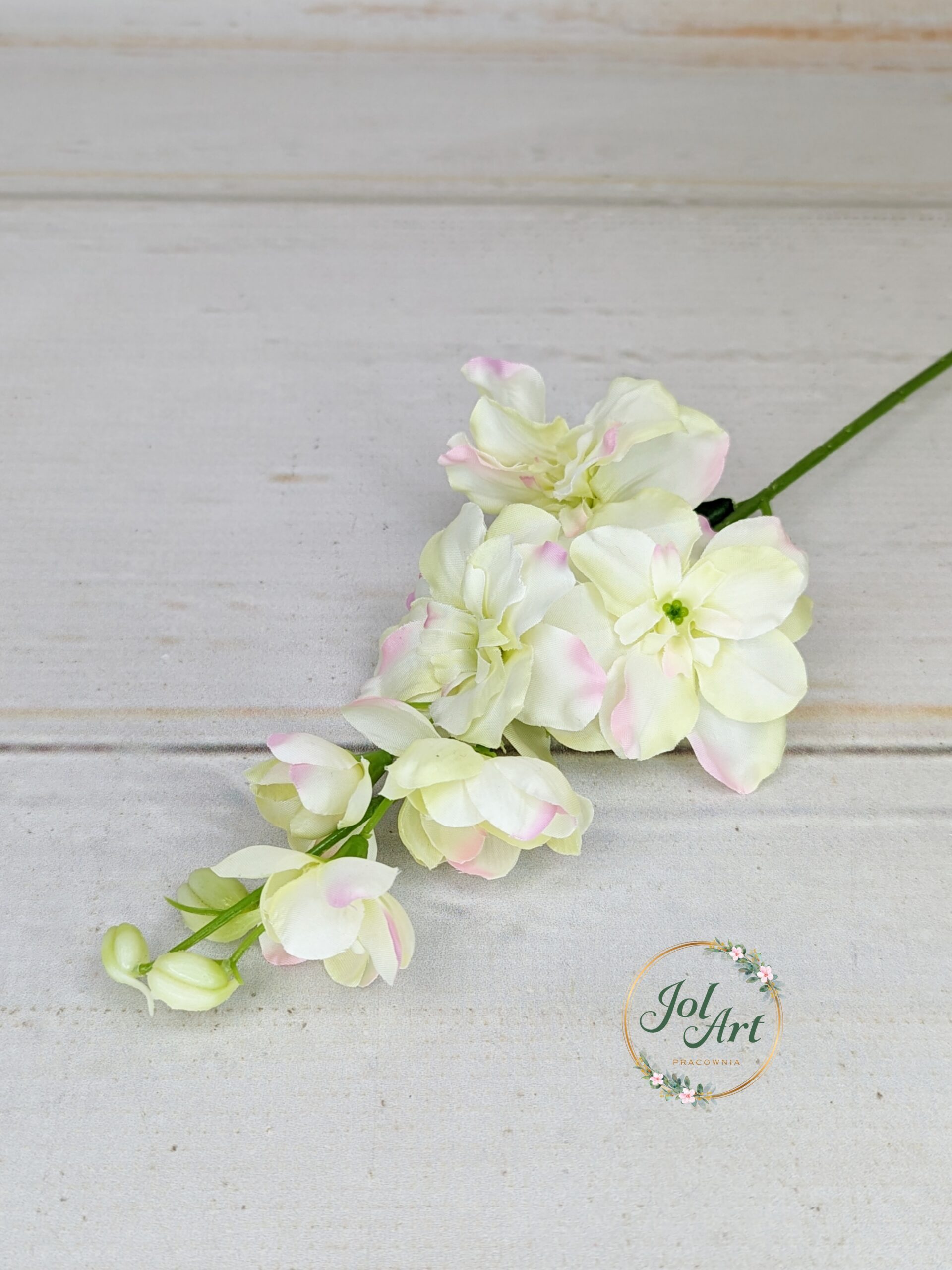 Ostróżka na piku to idealne wypełnienie do kompozycji. Krótki pik pozwala na umieszczenie gałązki w gąbce florystycznej lub niedużej kompozycji w wazonie. Gałązka długości 45 cm z kilkoma główkami kwiatowymi, zakończona imitacją pączków kwiatowych.