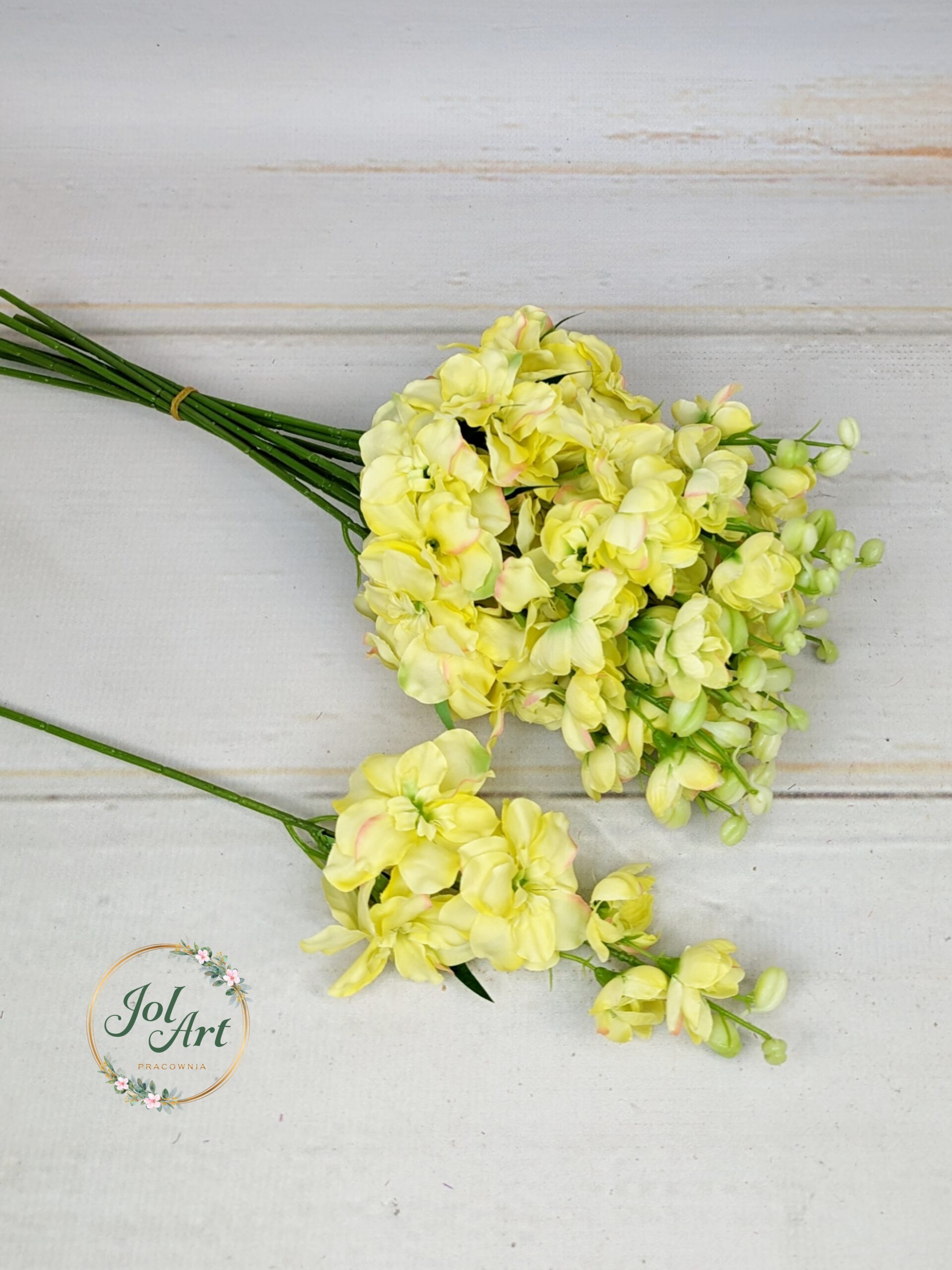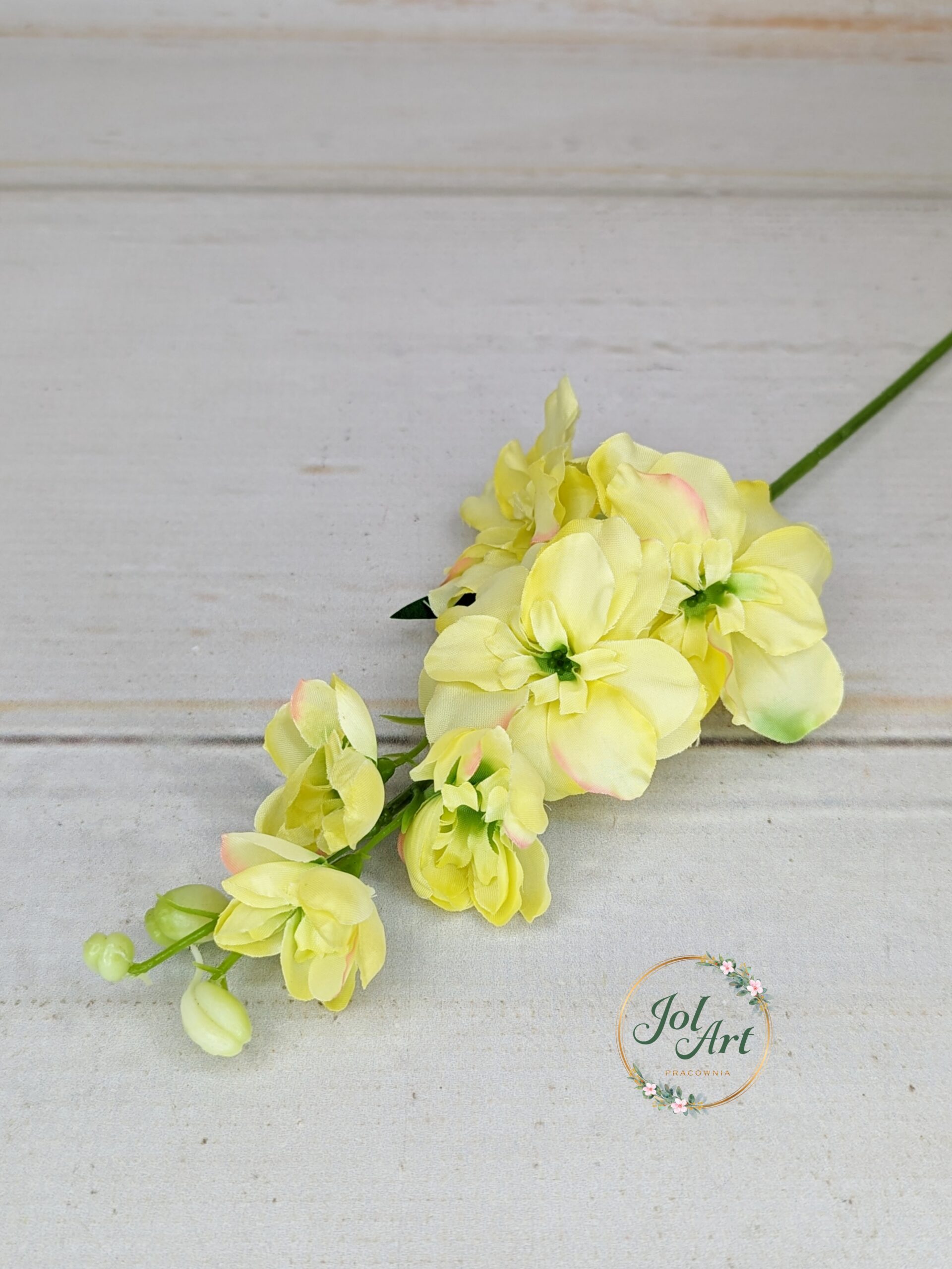 Ostróżka na piku to idealne wypełnienie do kompozycji. Krótki pik pozwala na umieszczenie gałązki w gąbce florystycznej lub niedużej kompozycji w wazonie. Gałązka długości 45 cm z kilkoma główkami kwiatowymi, zakończona imitacją pączków kwiatowych.