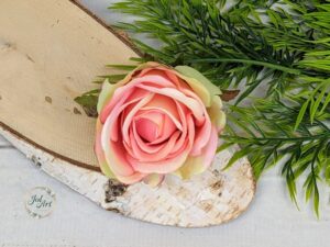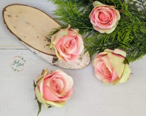 Róża wyrobowa wykonana z wysokiej jakości tkaniny w odcieniach od najjaśniejszych bieli, kremów i ecru po głębokie czernie, granat, grafit czy burgundy. Główki róży są klejone, przez co zachowują prawidłowy układ płatków. Polecana do kompozycji stołowych, nagrobnych, na wiankach, w koszykach, doniczkach i w wazonach.
