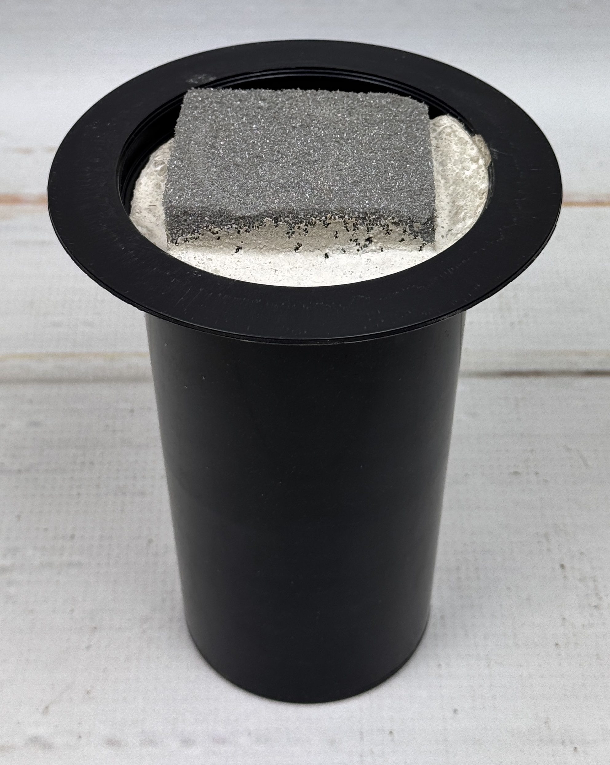 Wazon w kolorze czarnym obciążona mrozoodporną zaprawą betonową i suchą kostką umieszczoną na środku.